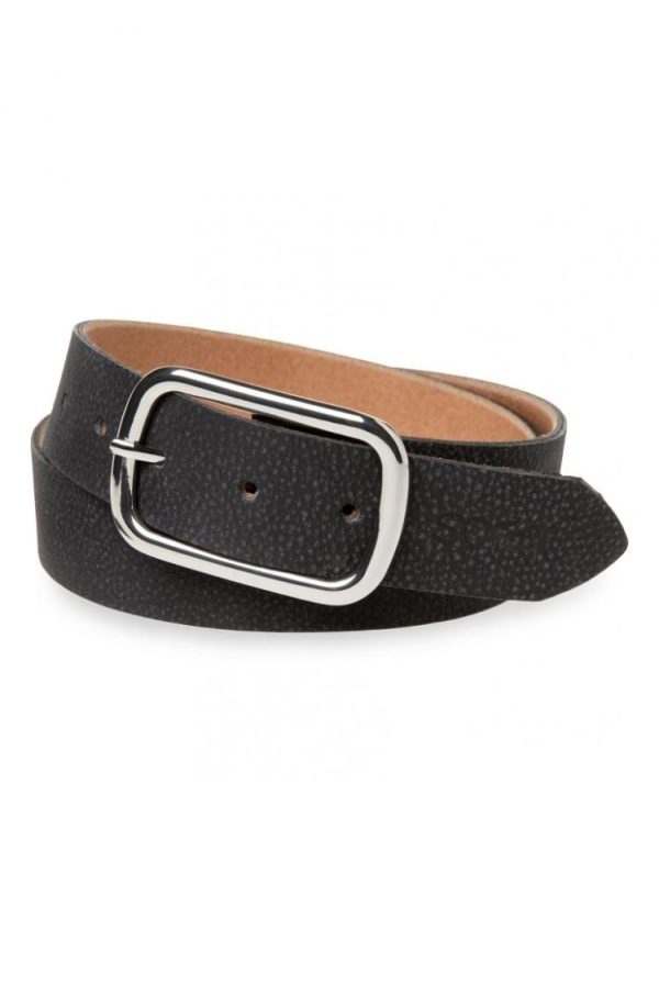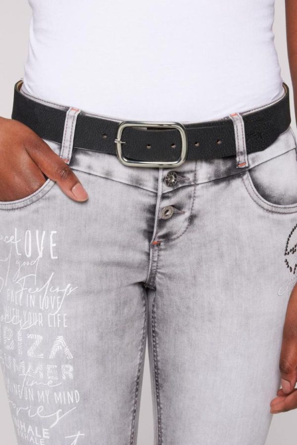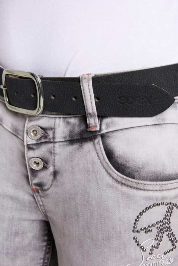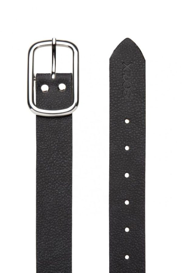 Der matt-schwarze Rindsledergürtel von SOCCX akzentuiert den Denim-Look. Er ist mit einer abgerundeten, allergikerfreundlichen Dornschließe gestaltet, hat eine leichte Narbung und einen Logo-Prägung an der Gürtelspitze. Hinweise: Dieser Gürtel kann auf andere, hellere Materialien abfärben! Die angegebenen Längen beziehen sich vom Schnallenbeginn bis zum 3. Loch gemessen. Breite ca. 3,5 cm.