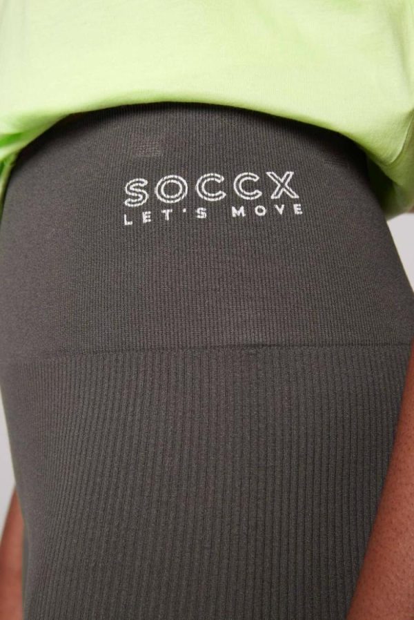 Die SOCCX Leggings bietet einen hervorragenden Tragekomfort und trumpft mit einer tollen Ripp-Jacquard-Struktur. Sehr angenehm ist der breite Bund mit seinem schmückenden Logo Print. Die Sporttights findet auch neben dem Fitnesstraining viele Styling-Möglichkeiten. Das Model ist 176 cm groß und trägt Gr. S.