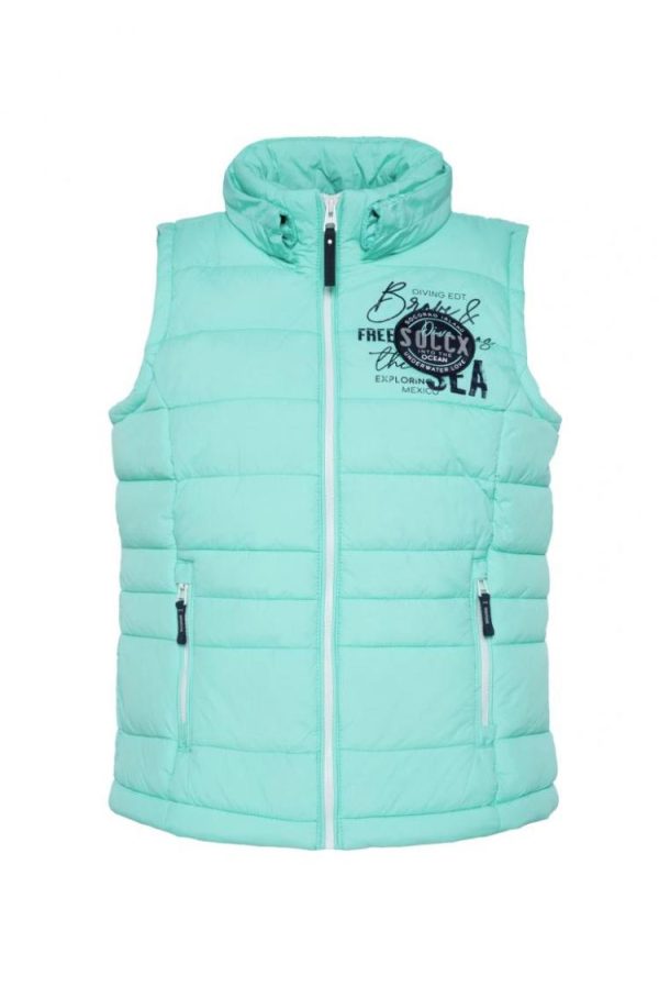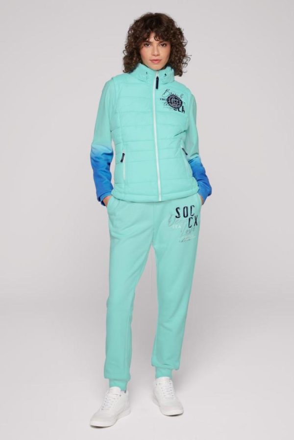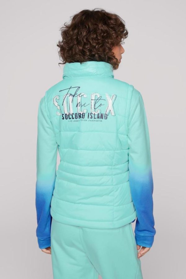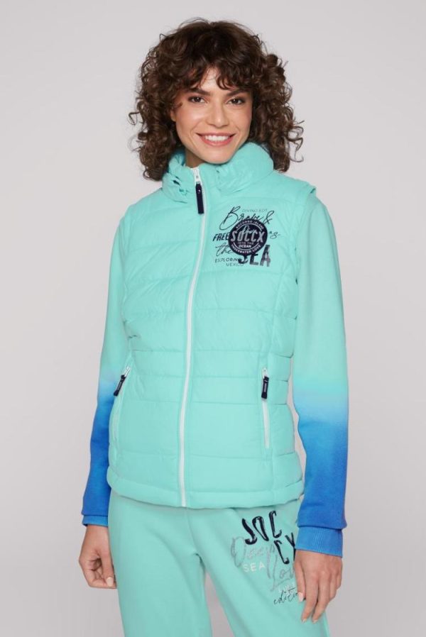 Schön designt ist die Rollkapuze im Stehkragen bei dieser SOCCX Steppweste. Die Weste hat eine Windfangleiste am Frontzipper und verschließbare Einschubtaschen. Ein schmückendes Artwork ist auf der linken Vorderseite platziert, ein großes Logo zieht auf der oberen Rückenpartie alle Blicke auf sich. Das Model ist 177 cm groß und trägt Gr. S.