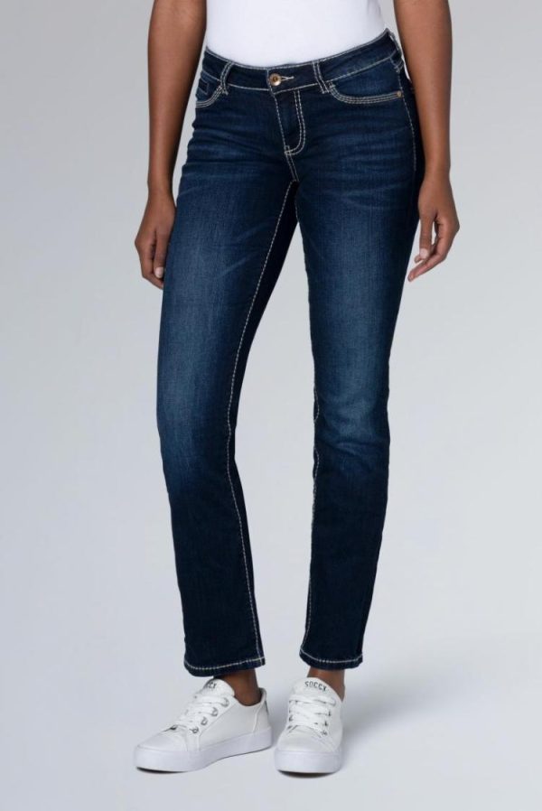 Dark Blue Denim von SOCCX mit Used-Waschung und breiten, farbigen Steppnähten. Die Jeans hat eine normale Leibhöhe mit geraden Beinverlauf. Durch den Stretchanteil und die Oberschenkelweite ist sie angenehm zu tragen. Es ist ein klassischer Five-Pocket-Style der sich vielseitig kombinieren lässt. Sonderverpackung Jeans: Für den Erhalt der Used-Optik werden die Hosenbeine der Jeans gerafft und in einer speziellen Verpackung geliefert.