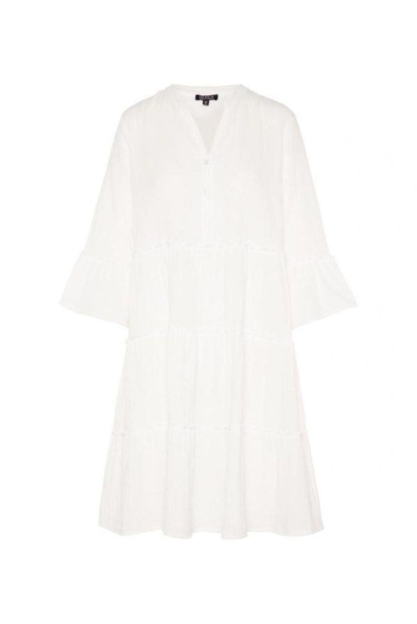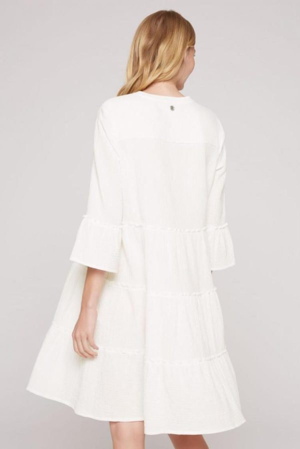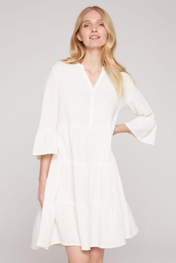 Sommer-Feeling kommt mit diesem luftigen Kleid von SOCCX auf. Es hat eine schöne Musselin-Struktur und einen modernen Schnitt mit Tunika-Ausschnitt und Volants an den verkürzten Ärmeln und am Rockteil. LOVE, HOPE, JOY! Viel Freude beim Ausführen! Das Model ist 179 cm groß und trägt Gr. S.