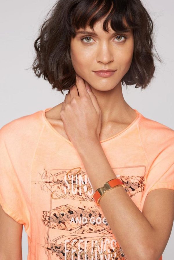 Armreifen sind wieder da! Dieser goldfarbene Armreif mit buntem Lederbesatz von TOKYO JANE ist ein stilvolles Schmuckstück und veredelt jeden Look. Er hat eine ovale Form und ist durch ein Federscharnier aufklappbar. Breite 2 cm, Durchmesser 7 cm.