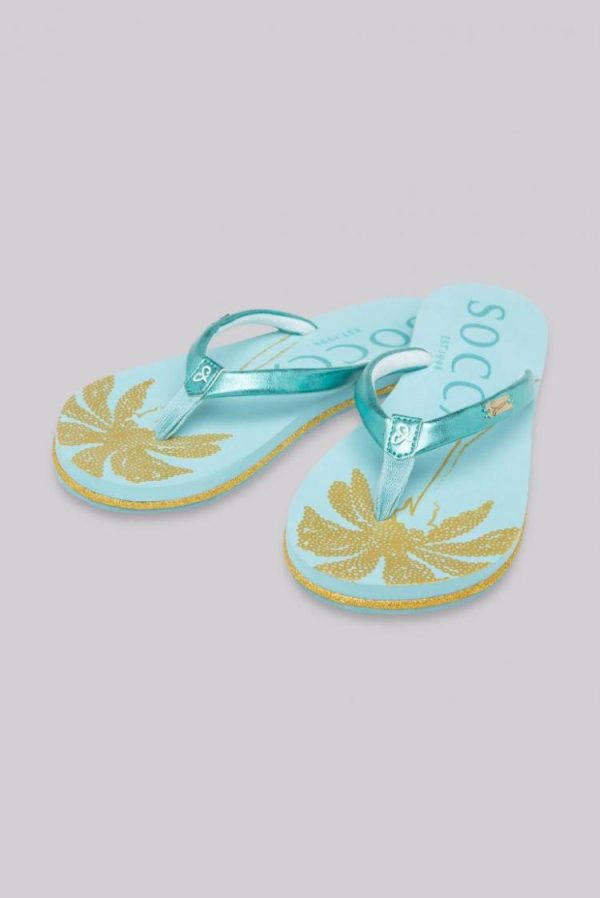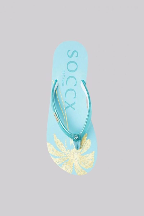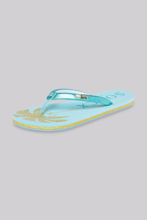 Endlich wieder Barfuß unterwegs sein mit dem trendigen Zehentrenner von SOCCX. Die gepolsterten Synthetikriemen setzen auf viel Glow, sind mit Logo-Applikationen gestaltet und haben ein weiches Jerseyfutter. Ein sommerliches Artwork mit Logo-Prägungschmückt die Innensohle, ein Glitzerstreifen die Seiten der Schuhsohle. Der Schuh hat eine rutschfeste Gummiaußensohle. Weite: G (Normalweite).