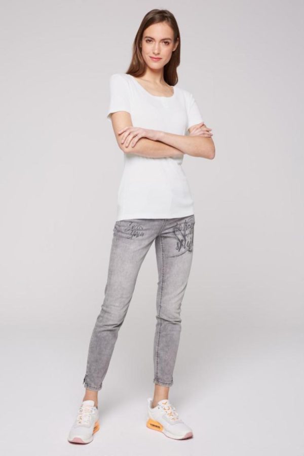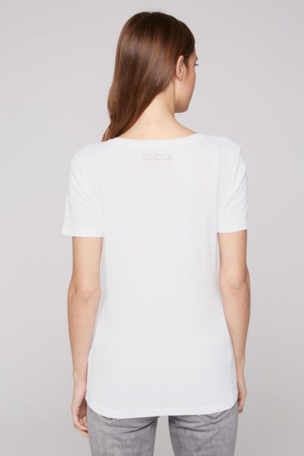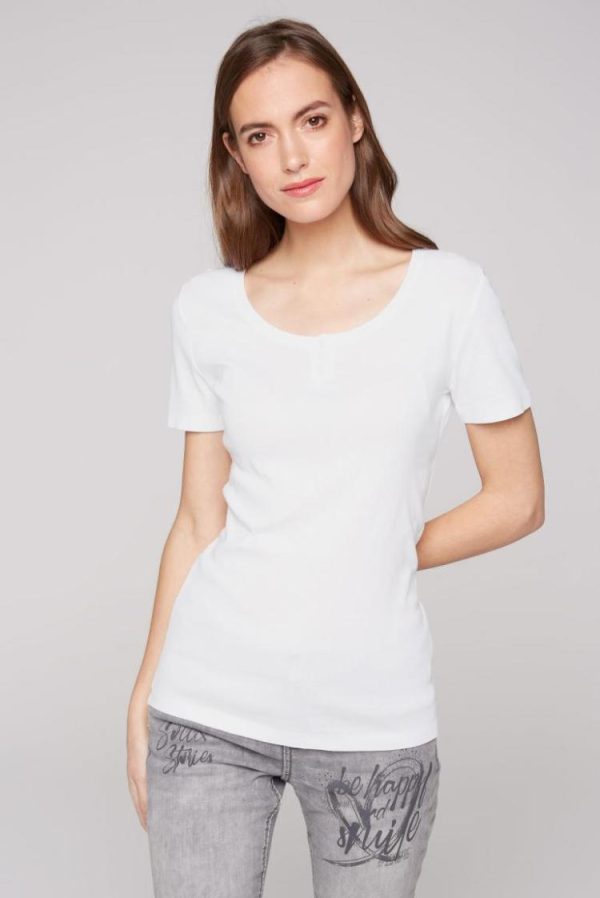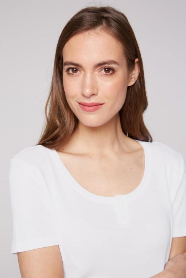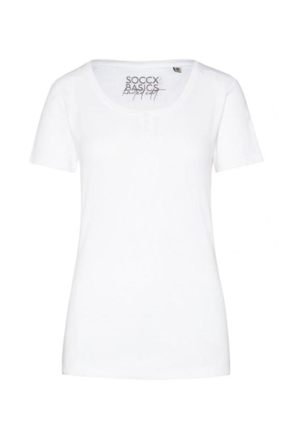 Ein tolles Sommer-Basic ist das gerippte T-Shirt mit kurzer Knopfleiste von SOCCX. Es ist super angenehm zu tragen und passt einfach zu allem. Das Model ist 176 cm groß und trägt Gr. S.