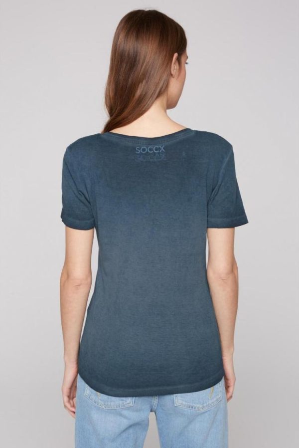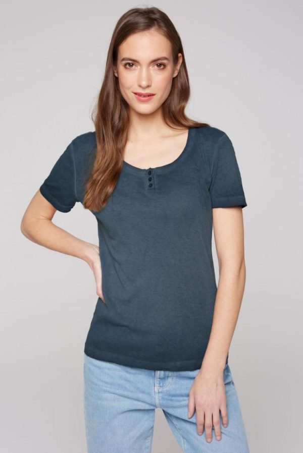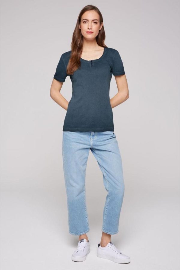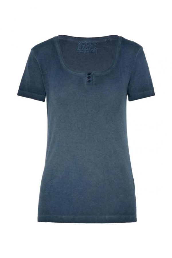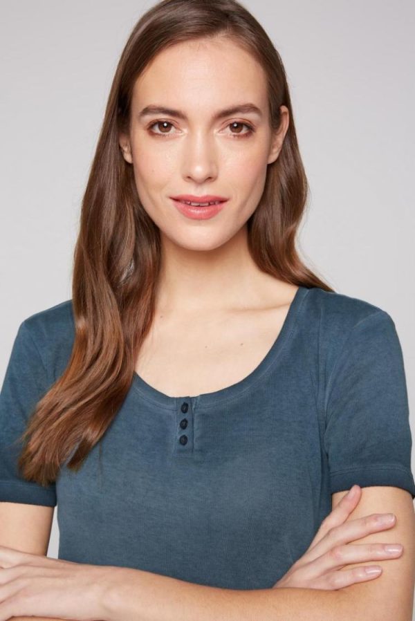 Ein tolles Sommer-Basic ist das gerippte T-Shirt mit kurzer Knopfleiste von SOCCX. Es hat schöne Farbschattierungen durch die spezielle Färbung und ist super angenehm zu tragen. Das Model ist 176 cm groß und trägt Gr. S.