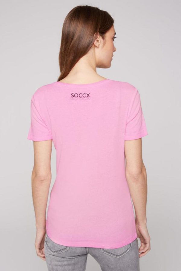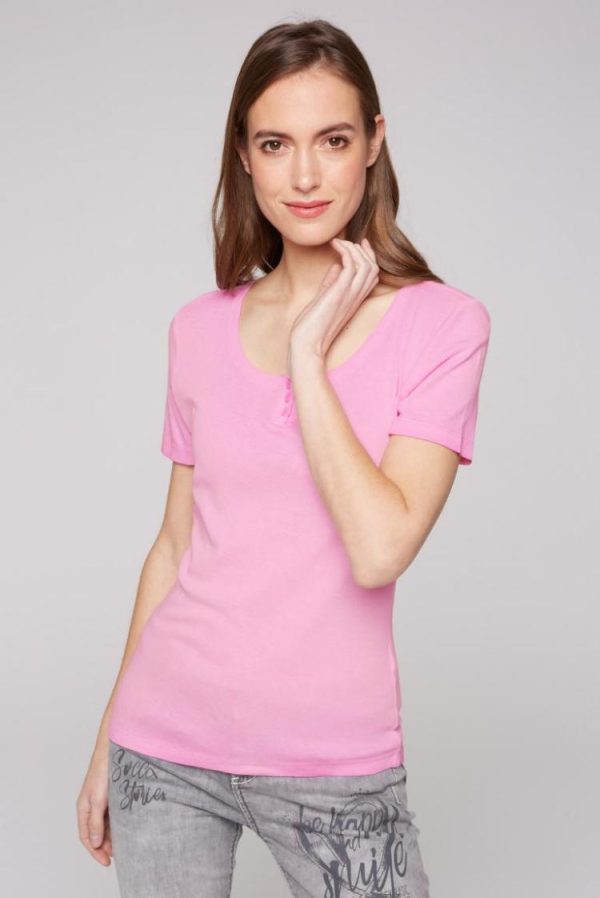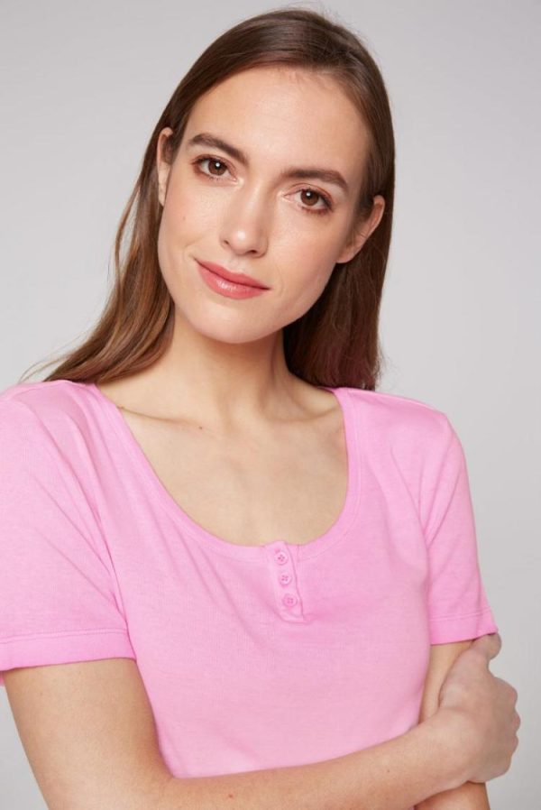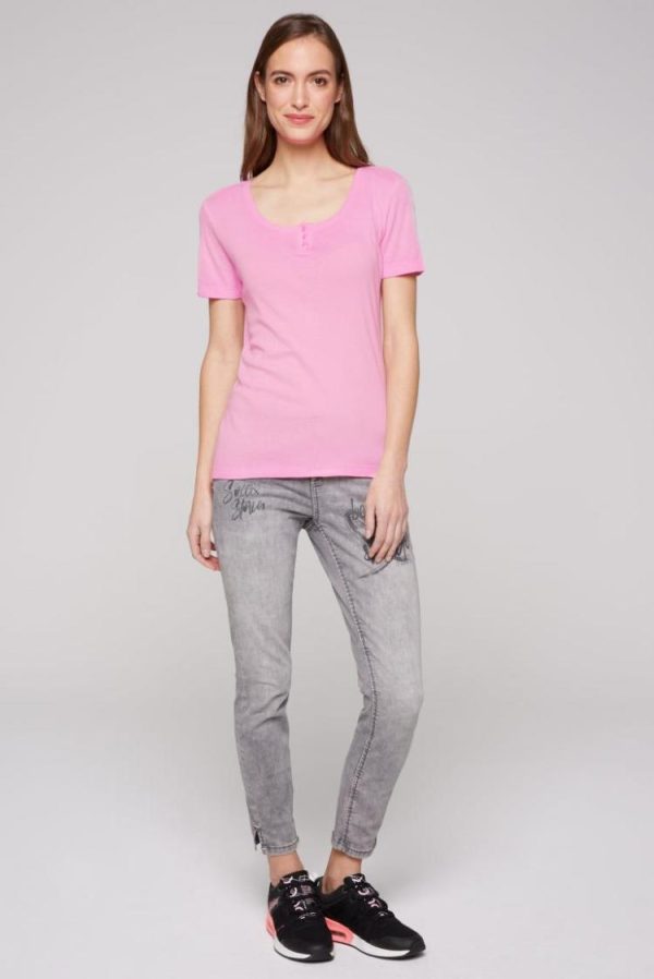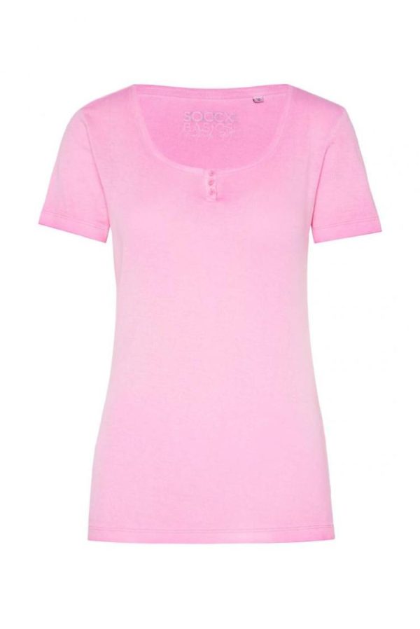 Ein tolles Sommer-Basic ist das gerippte T-Shirt mit kurzer Knopfleiste von SOCCX. Es hat schöne Farbschattierungen durch die spezielle Färbung und ist super angenehm zu tragen. Das Model ist 176 cm groß und trägt Gr. S.