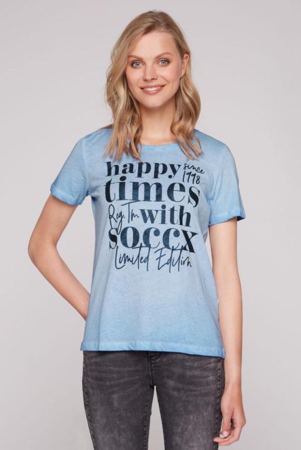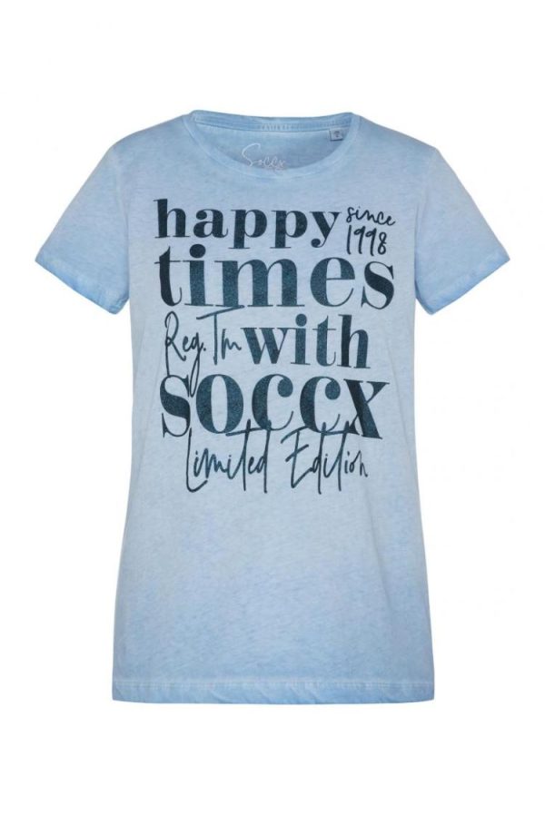 Happy times with SOCCX! Das SOCCX T-Shirt setzt auf eine lässige Used-Färbung und auf einen schmückenden Glitzer-Wording-Print auf der Vorderseite. In vielen coolen Farben erhältlich! Das Model ist 177 cm groß und trägt Gr. S.