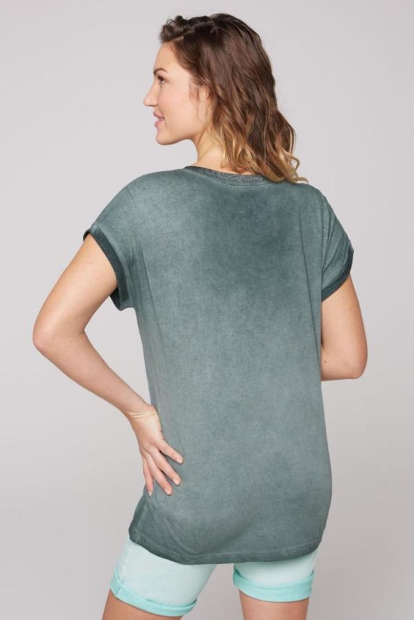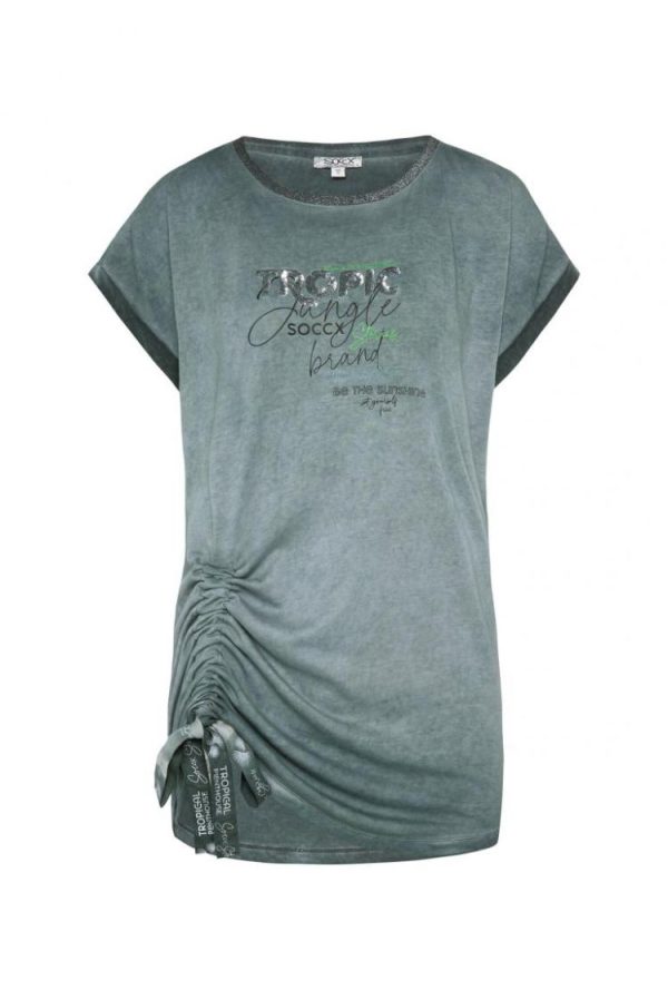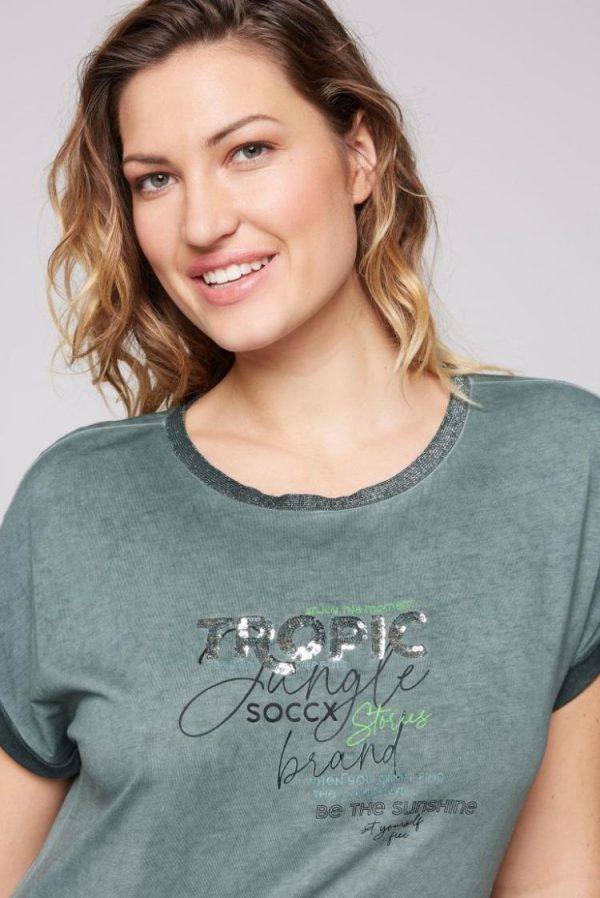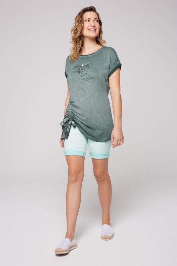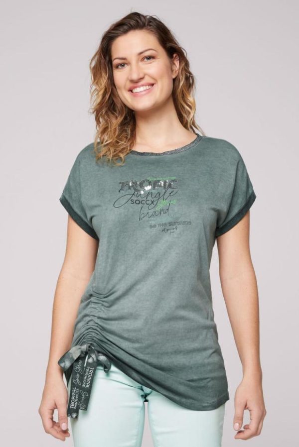 Das schöne Freizeitshirt von SOCCX funkelt mit vielen tollen Details! Der Rundhalsausschnitt ist mit einer Glitzerblende abgesetzt, die Artwork mit Pailletten verziert. Was aber noch stärker auffällt, ist die Raffung mit dem breiten Zugband. Das Model ist 175 cm groß und trägt Gr. S.