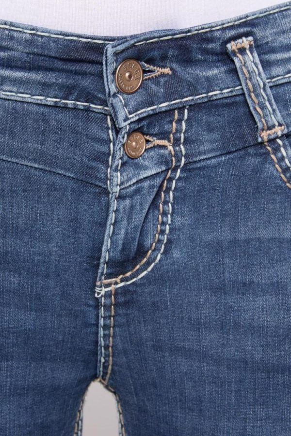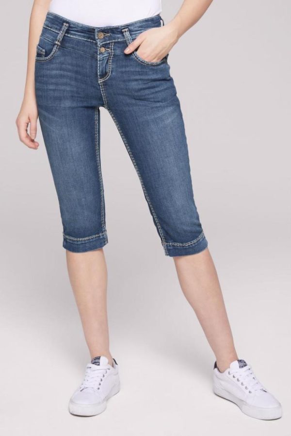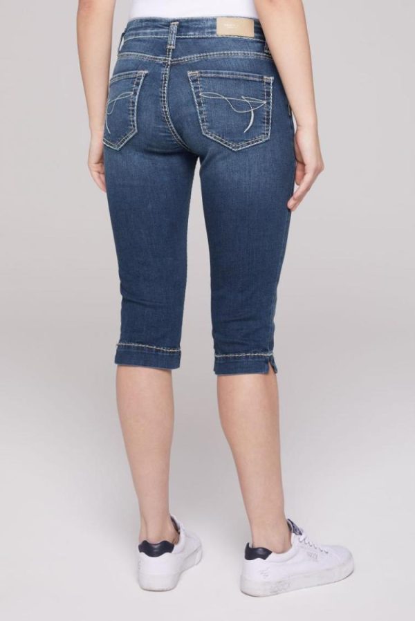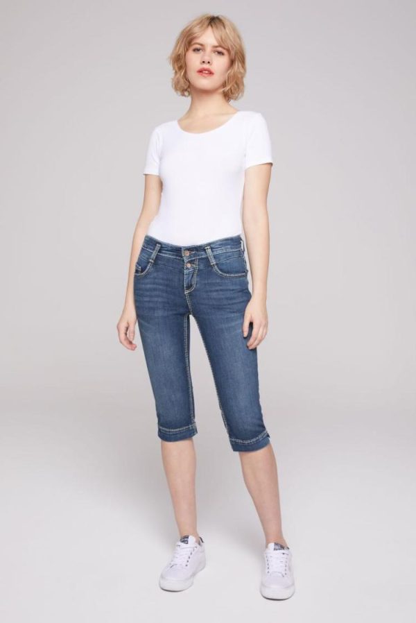 Breite Kontrastnähte und ein Knopf-Detail setzen die Indigo-Waschung perfekt in Szene. Die Capri Jeans von SOCCX hat eine gute Elastizität und Oberschenkelweite, sowie einen Saum-Schlitz. Das Model ist 175 cm groß und trägt W27.