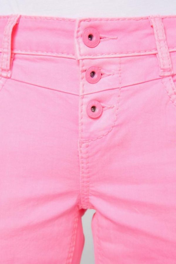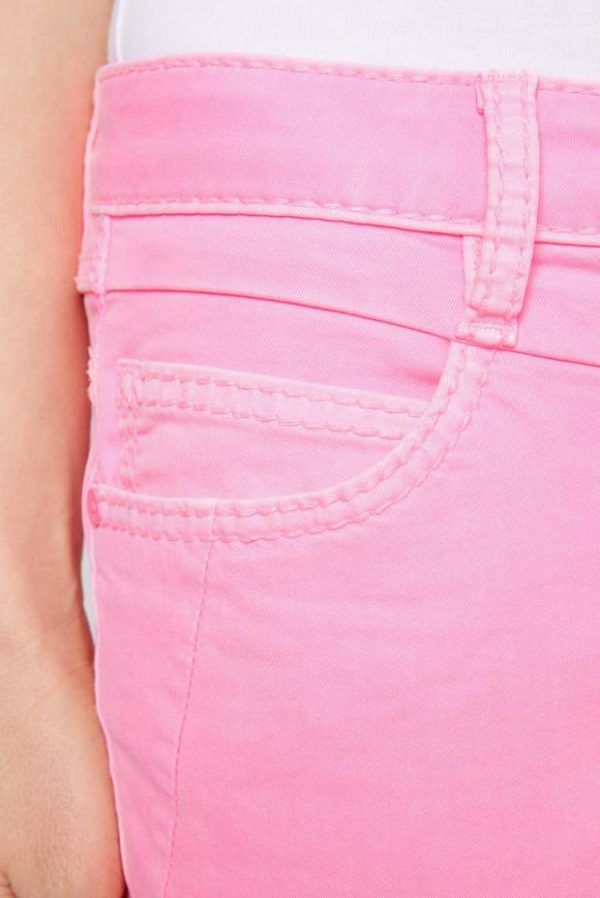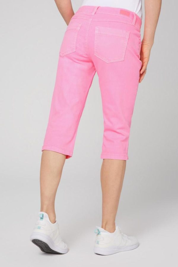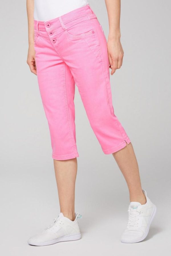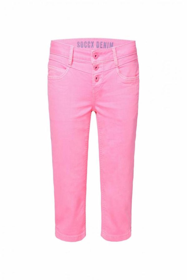 Ein Sommer-Highlight ist die Capri Jeans von SOCCX in leuchtenden Farben oder in Opticwhite. Die figurbetonende Capri Jeans ist mit einer Knopfleiste gestaltet, mit einer normalen Oberschenkelweite und kleinen Schlitzen am Saum. Die Ziernähte oben an der Seitennaht verjüngen optisch den Oberschenkel, die Abnäher hinten am Sattel heben optisch das Gesäß. Die kurze Denim ist ein super Basic! Das Model ist 170 cm groß und trägt W27.